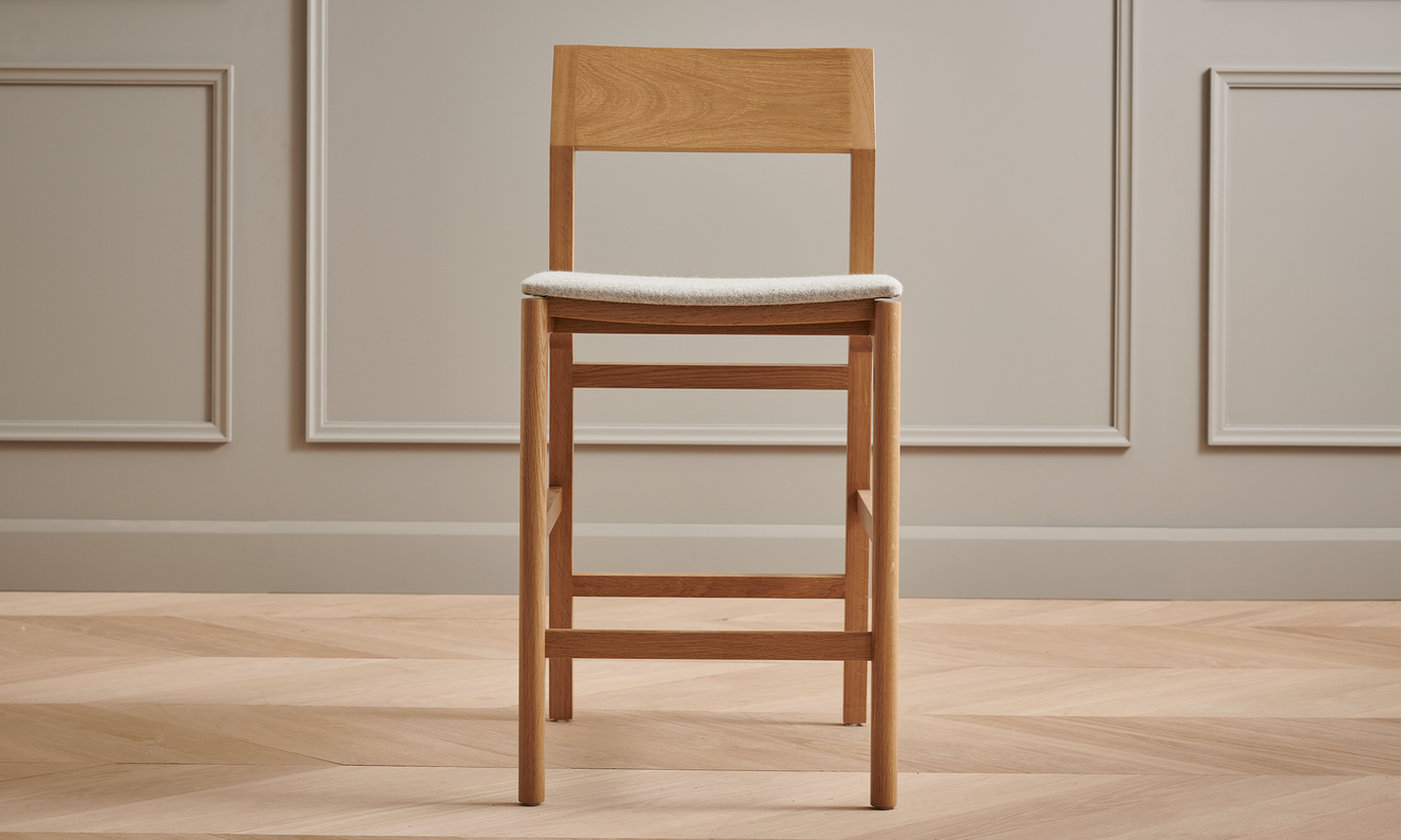Inspiré de notre collection de chaises, le C402 est un tabouret fabriqué à la main avec une assise rembourré et un dossier incliné. Le cadre en bois massif est soutenu par 4 traverses horizontales, ce qui lui confère une solidité supplémentaire tout en conservant les proportions délicates du C205 original.